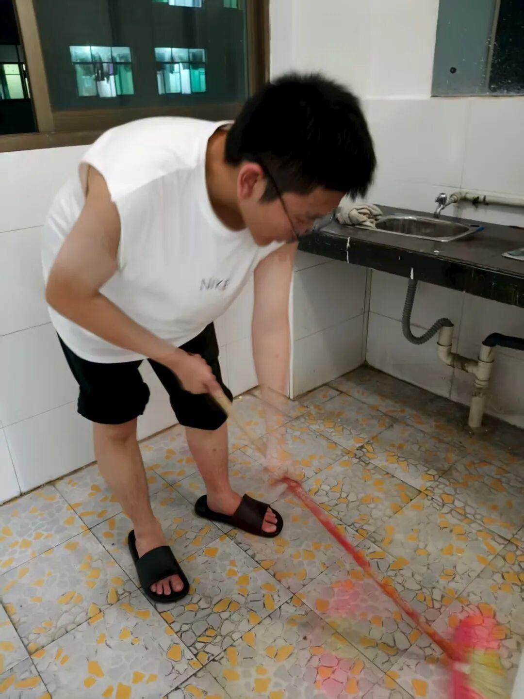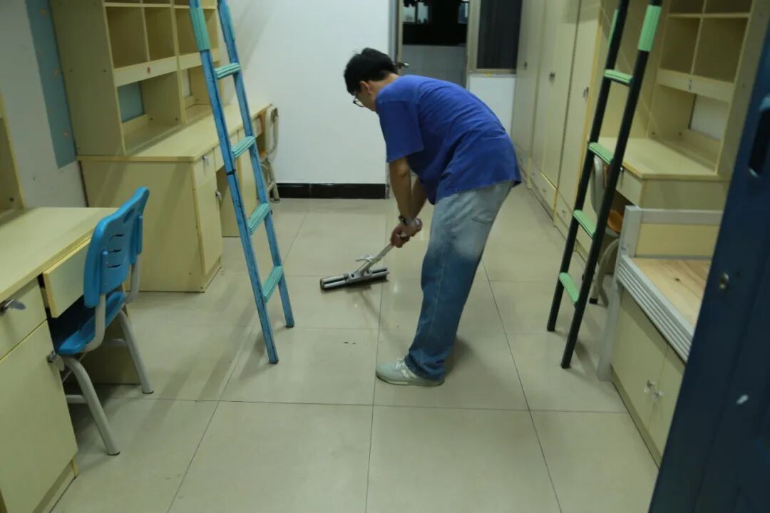 活动启动后,志愿者们迅速以小组为单位明确分工,形成 “协作有序、高效联动” 的清扫格局。从逐一清理宿舍桌面、归置散落的各类物品,到擦拭门窗玻璃与窗框的积尘、用抹布仔细擦拭衣柜、书桌的边角缝隙,再到手持扫帚清扫地面浮尘、握着拖把拖洗地板,每一个环节都凝聚着志愿者的细致与用心。尽管晚间天气依旧闷热,汗水很快浸湿了志愿者的衣衫,但大家始终保持着高涨的热情,用耐心与责任心为新生“焕新”居住空间。