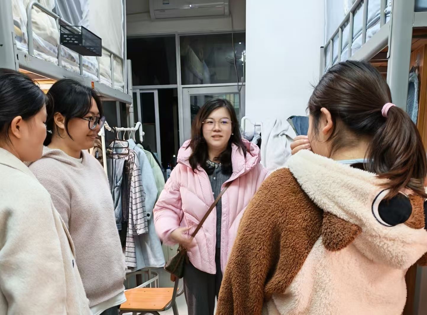 在下寝走访过程中,刘灵婷副书记与同学们亲切交谈,详细了解同学们的到校情况、假期生活及返校适应状态。老师们关切询问开学课程安排,提醒同学们及时调整作息、规划学习,以饱满积极的状态投入新学期的学习生活。